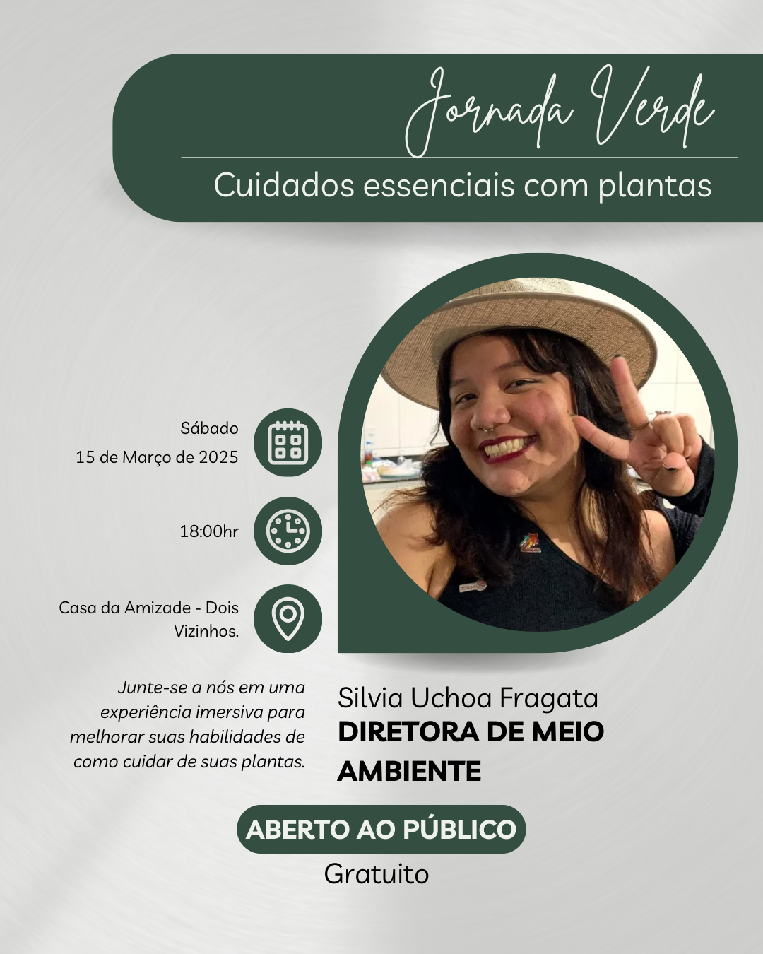 🌱 Vem aí um Workshop Gratuito sobre Cuidados Essenciais com Plantas, ministrado pela incrível companheira Silvia Fragata. Será um momento de aprendizado, troca de experiências e conexão com a natureza!