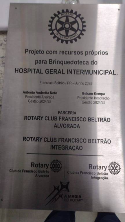 Foi inaugurada em 04/07/2025, brinquedoteca do Hospital Intermunicipal de Francisco Beltrão, fruto de uma parceria entre o Rotary Club de Francisco Beltrão Alvorada e o Rotary Club de Francisco Beltrão Integração. O espaço foi cuidadosamente planejado e equipado para oferecer acolhimento e bem-estar às crianças em tratamento e seus acompanhantes.