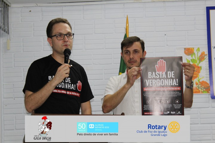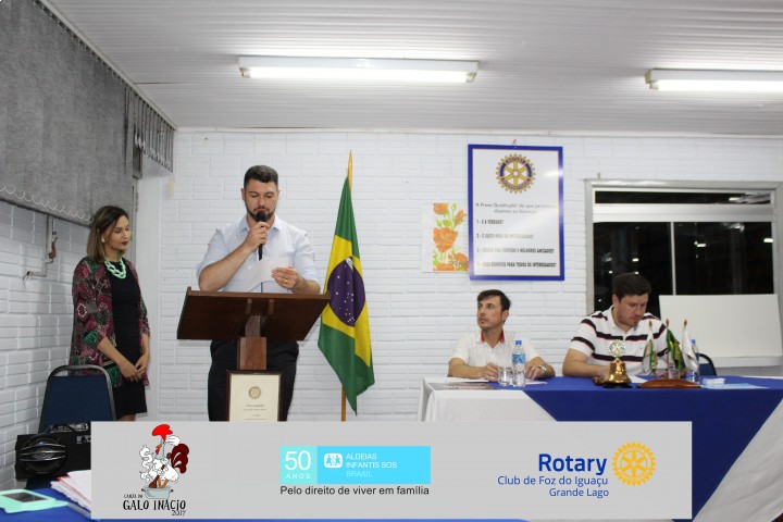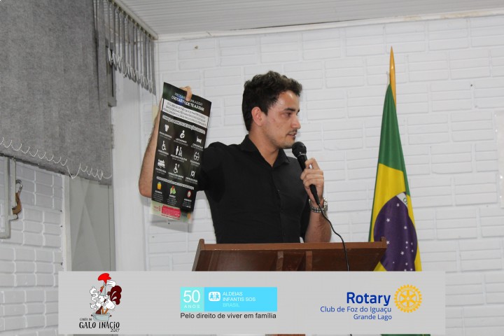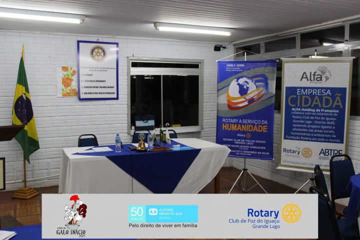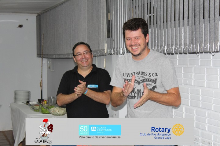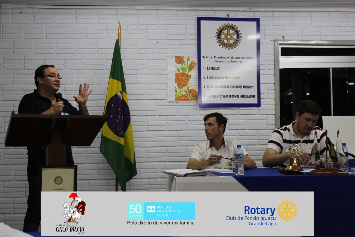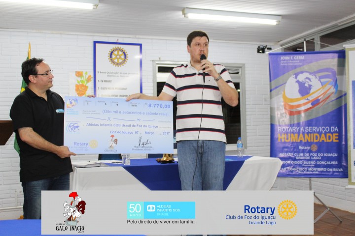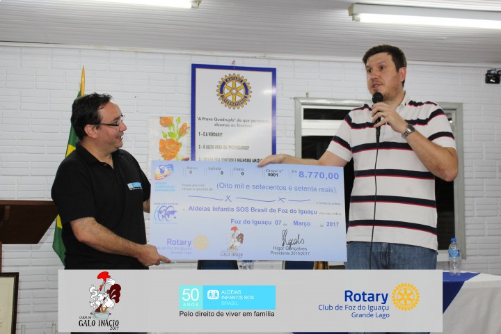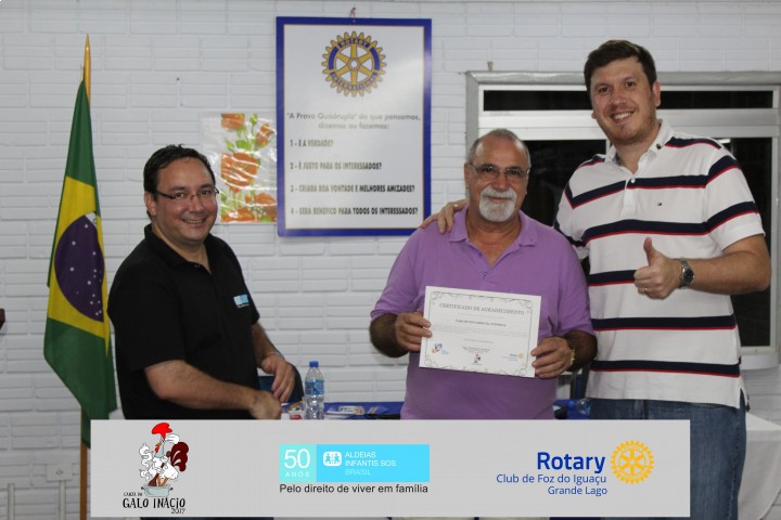 Prestação de contas da Canja do Galo Inácio 2017. Nesta terça tivemos a 24ª reunião do ano rotário 2016/2017na sede do Rotary Club de Foz do Iguaçu Grande Lago para homenagear o Chefe voluntário da Cozinha da Canja Sr. Carlos Eduardo da Fonseca do Rotary Club Três Fronteiras e com o representante da Aldeias Infantis SOS Brasil de Foz do Iguaçu Sr. Alex Decian Thomazi, onde este e o próprio Grande Lago fizeram a prestação de contas do evento promovido pelas duas entidades. Receita bruta de R$ 8.770,00 e líquida da venda de mais de 2700 canjas, além das camisetas exclusivas doadas por patrocinadores, foi de R$7.284,19, os quais serão direcionados totalmente ao projeto "Escola de Pais". Agradecemos a todos, principalmente aos voluntários, mais de uma dezena, que nos ajudaram a realizar este valor!