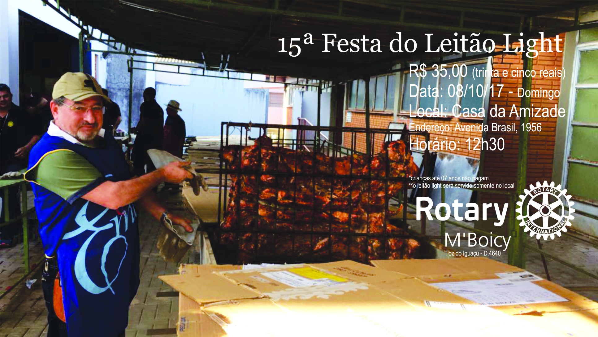 A 15º edição da Festa do Leitão Light já tem data confirmada – 08 de outubro. Os convites já estão sendo vendidos pelos integrantes do Rotary Club Foz do Iguaçu M´Boicy. O valor é de R$ 35 por pessoa, crianças até 07 anos não pagam. Toda renda arrecadada será destinada a projetos sociais mantidos pelo clube como o banco de colchões e o banco de óculos.