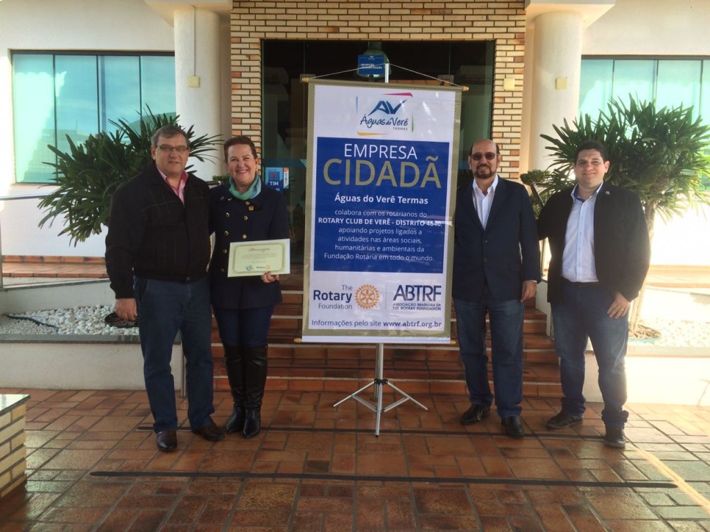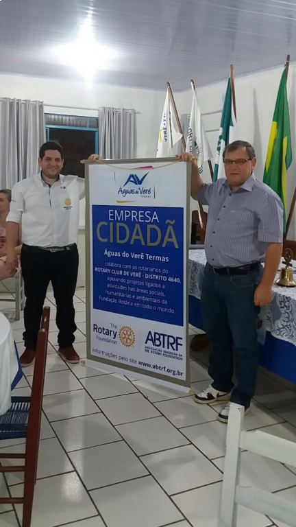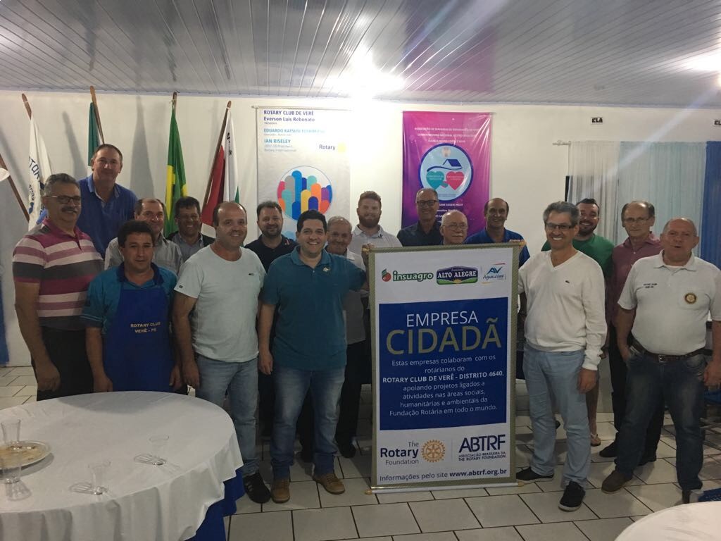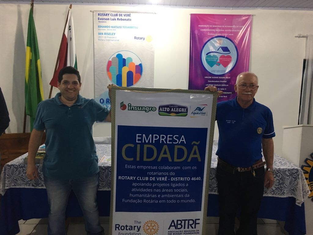 AS EMPRESAS INSUAGRO INSUMOS AGRÍCOLAS LTDA, TERMAS ÁGUAS DO VERÊ E LATICÍNIO ALTO ALEGRE, ADERIRAM AO PROGRAMA EMPRESA CIDADÃ, ONDE ASSUMIRAM UM TERMO DE COMPROMISSO DE DIREITOS E OBRIGAÇÕES COM O ROTARY CLUB DE VERÊ E A ABTRF (ASSOCIAÇÃO BRASILEIRA DA THE ROTARY FOUNDATION). OS RECURSOS REFERENTE AS DOAÇÕES, SERÃO DESTINADOS AOS DISTINTOS PROGRAMAS DA FUNDAÇÃO ROTÁRIA. EM MEU NOME, EVERSON LUIS REBONATO, PRESIDENTE ELEITO 2017/2018 DO ROTARY CLUB DE VERÊ, E EM NOME DE TODA A FAMÍLIA ROTARIA, QUEREMOS EXPRESSAR OS NOSSOS MAIS SINCEROS AGRADECIMENTOS AOS MEMBROS DIRETORES DAS EMPRESAS CIDADÃS, E QUE DEUS NA SUA INFINITA BONDADE, LHES CONCEDAM EM DOBRO TUDO AQUILO QUE FIZEREM DE BEM, EM PRÓL DE NOSSA COMUNIDADE LOCAL E DO MUNDO. SINTAMOS EM NOSSO CORAÇÃO O PRAZER DE FAZER O BEM SEM OLHAR A QUEM, ATRAVÉS DE NOSSAS AÇÕES E CONTRIBUIÇÕES.